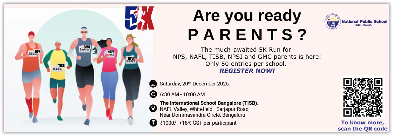 National Public School, Indiranagar is a co-educational school, founded in 1982 under the chairmanship of Dr. K. P. Gopalkrishna. This is the third school set up by Dr. K. P. Gopalkrishna after NPS Rajajinagar and NPS Chennai.