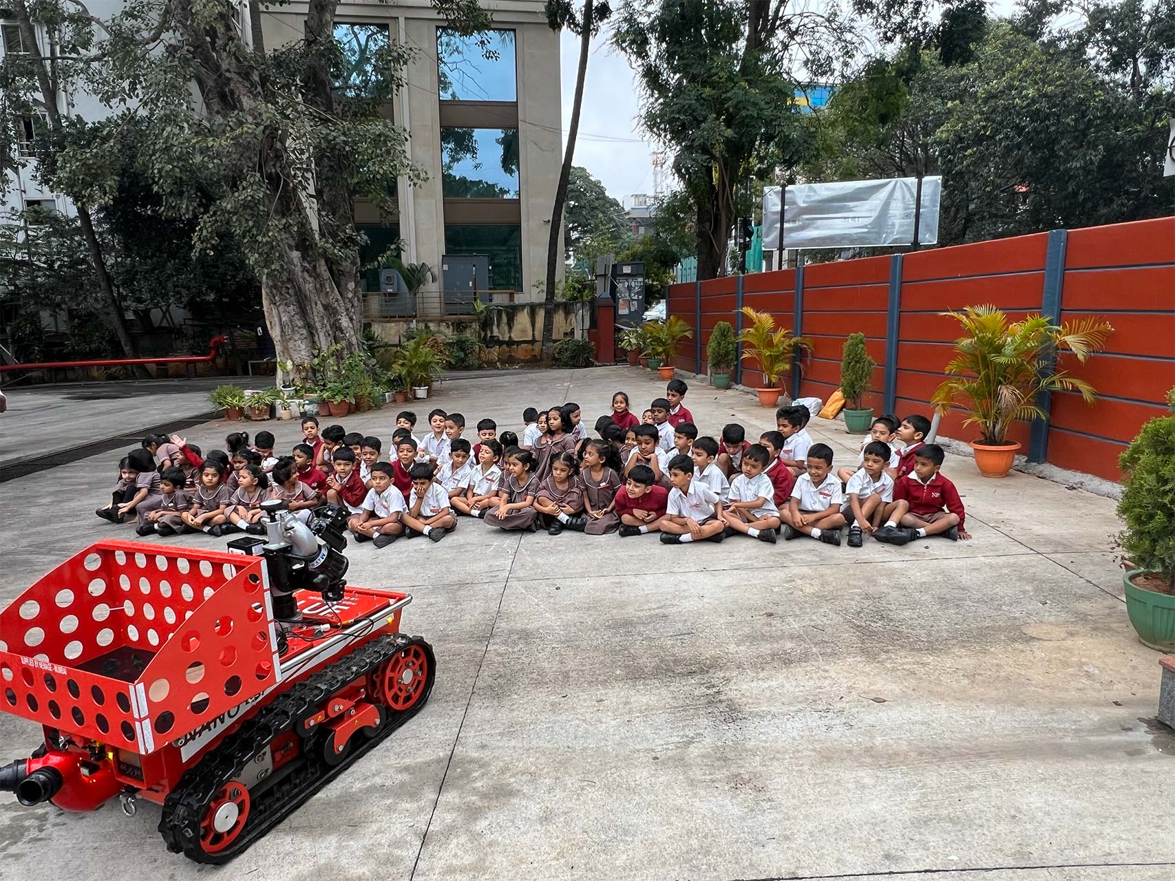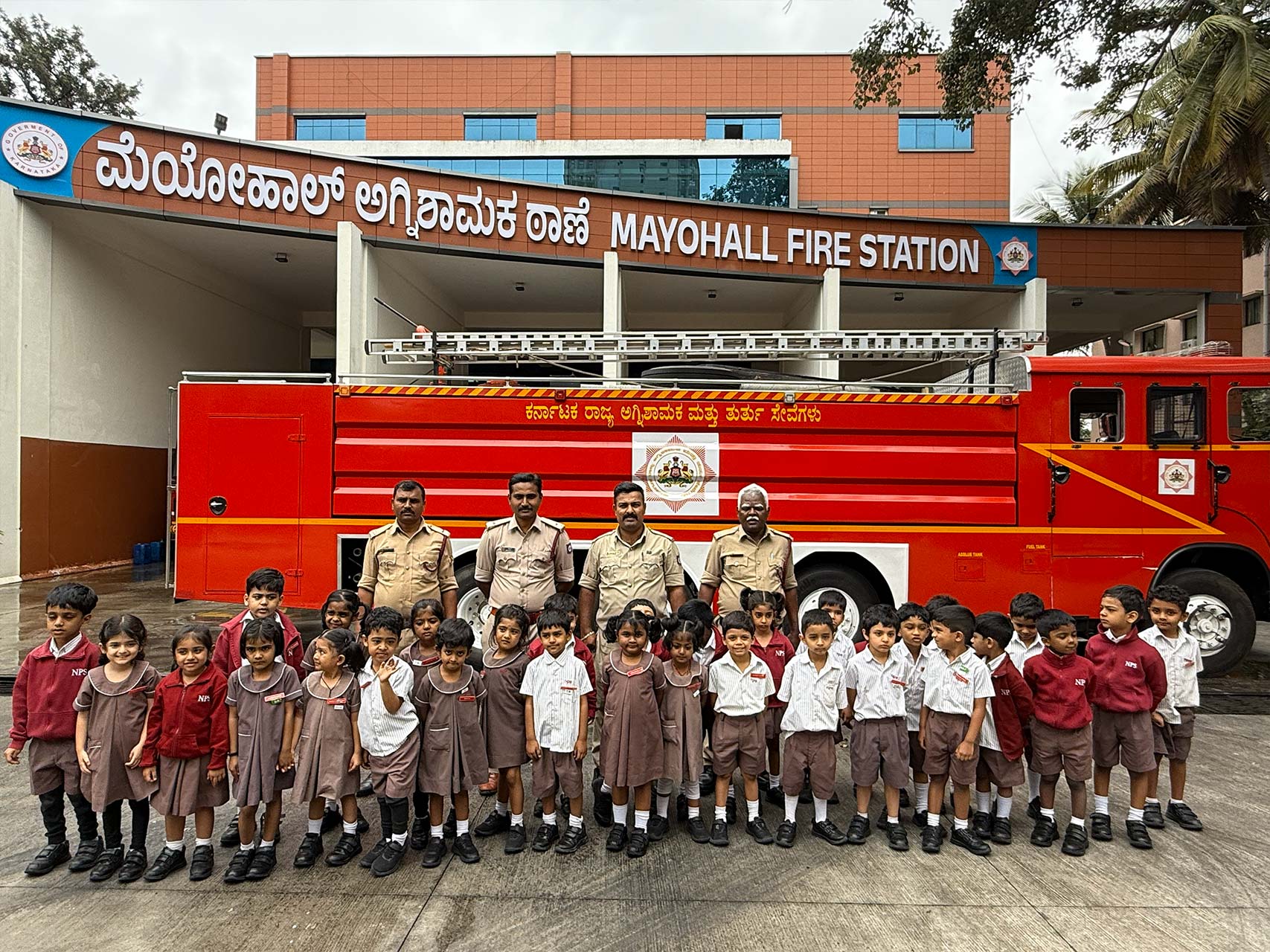 On Thursday, 16 October 2025, the Kindergarten students of National Public School, Indiranagar, visited the Mayo Hall Fire Station as an extension to their learning on ‘People Who Help Us’. Students were explained about the components of fire and the different types of fire. They witnessed a demonstration of practiced methods of extinguishing a fire, including a new addition to the firefighters’ toolkit, a robot that can move through narrow areas with a hose attached. Students were thrilled as the robot glided by, showering them with refreshing droplets from its hose. As a token of appreciation, the students presented the team with a card and a memento, and brought back good memories of the day.