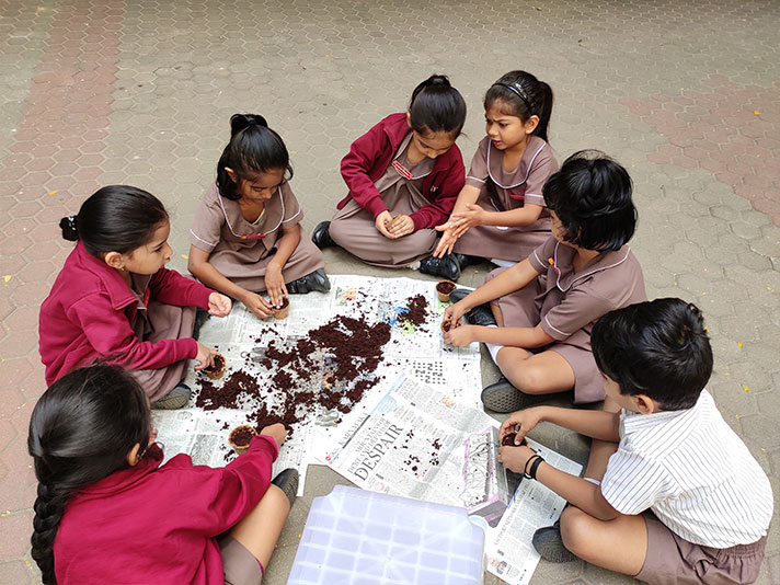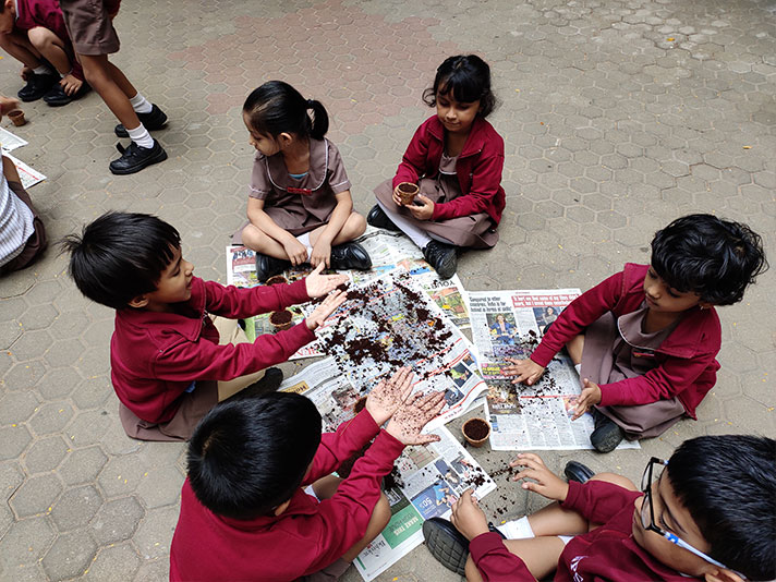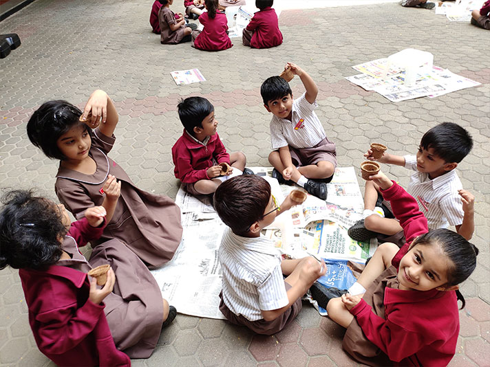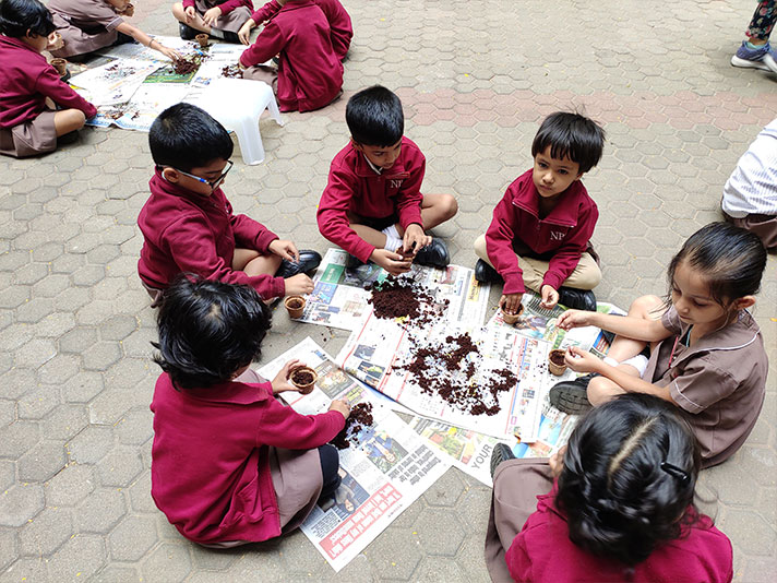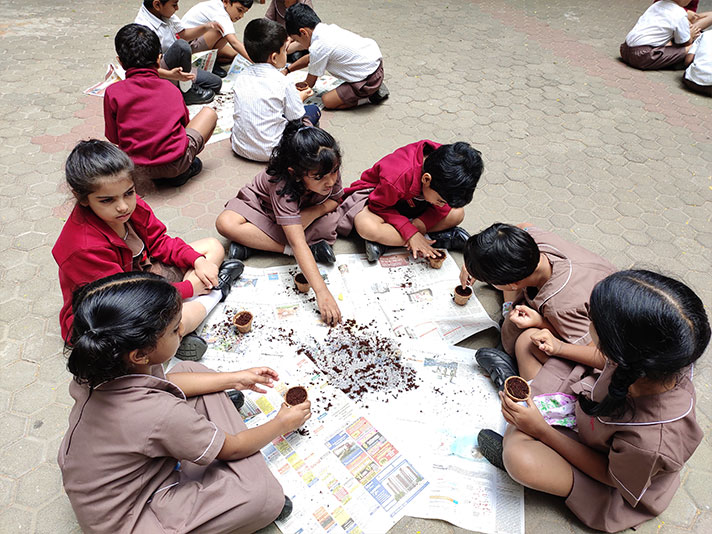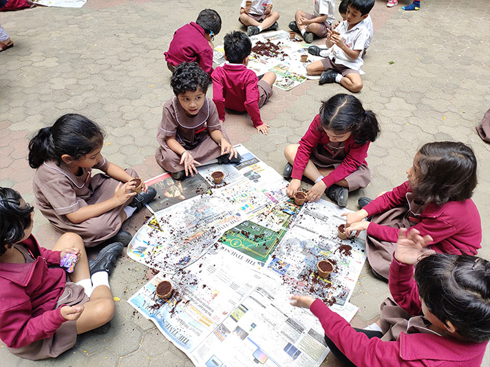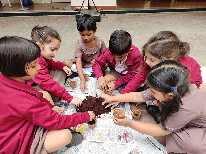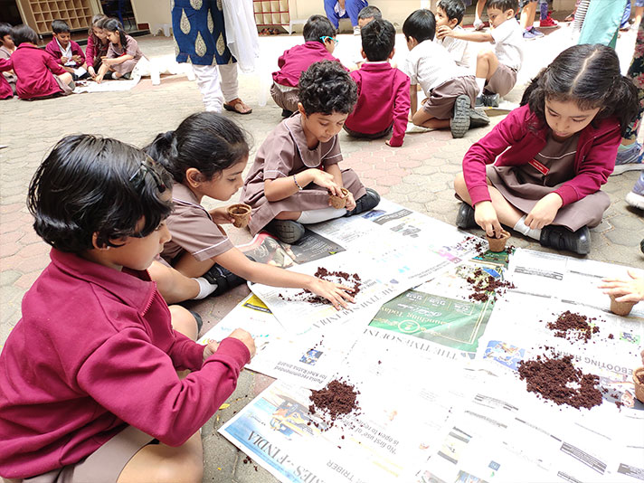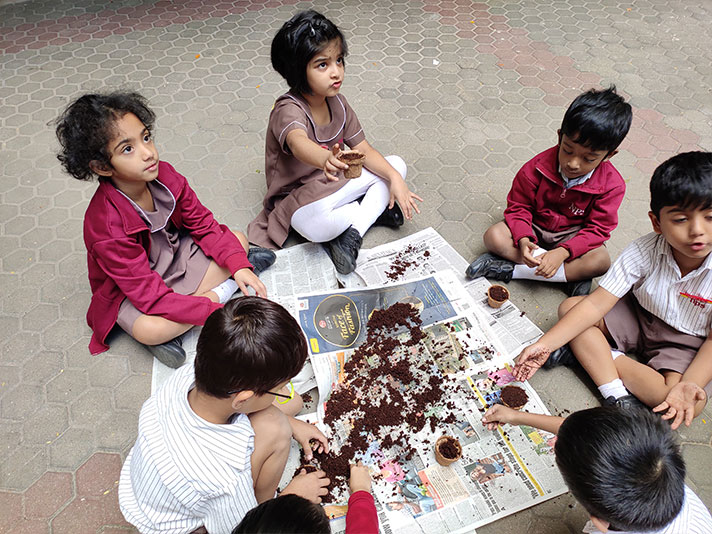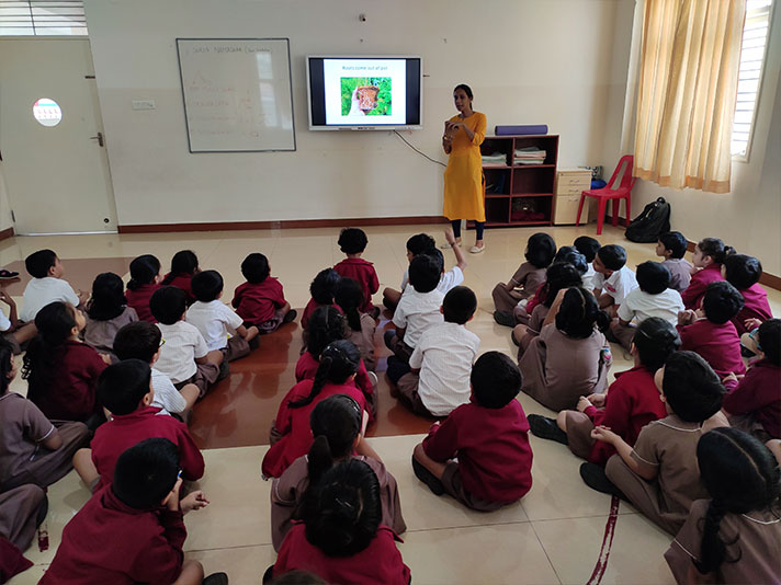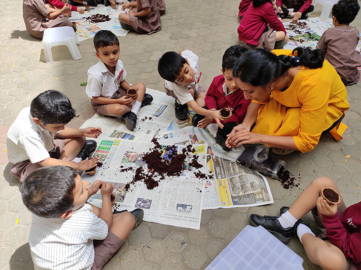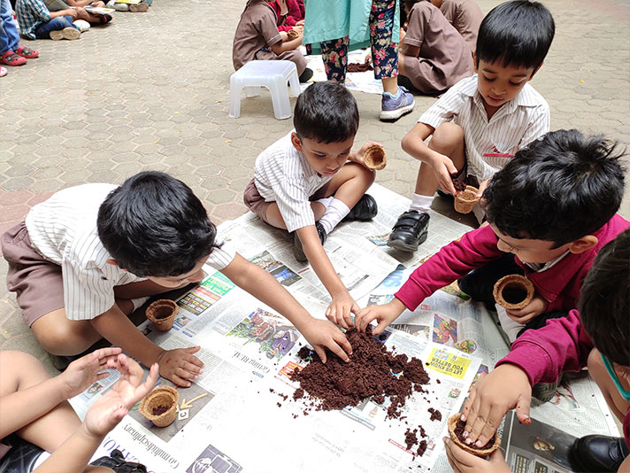 The students of KG 2 had an enjoyable day as they were given a hands on experience on ‘Potting of plants in biodegradable pots’. Ms Sangeeta M from an organisation called For green Foods gave the students an opportunity to plant the local vegetable seeds in coir pots. She first explained the process of plant growth through a PPT presentation and then showed the students a very informative video on how the bean plant grows within a duration of 25 days. She also explained to the students that one should use coir pots instead of plastic pots as it is environment friendly and plants grow faster in these pots as there is more breathing space for the plants. The students were given coco peat, a soil substitute which has good water holding capacity, a small biodegradable coir pot and a seed to sow. They were given a step by step instruction on the process of sowing and taking care of the plants. Students were very excited to take it home at the end of the day.
