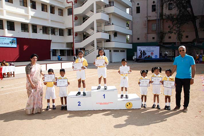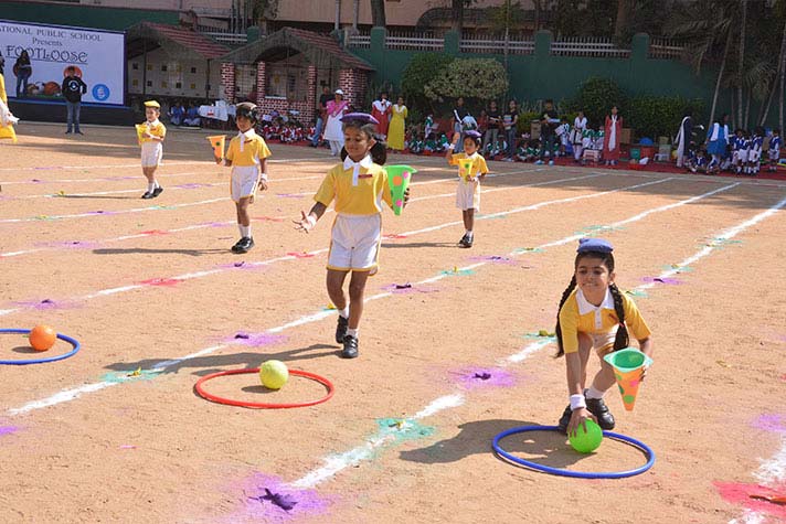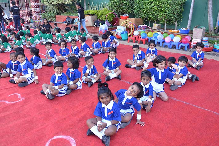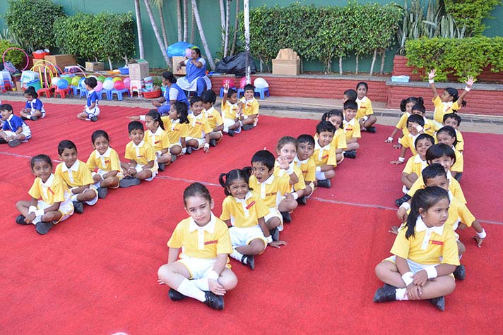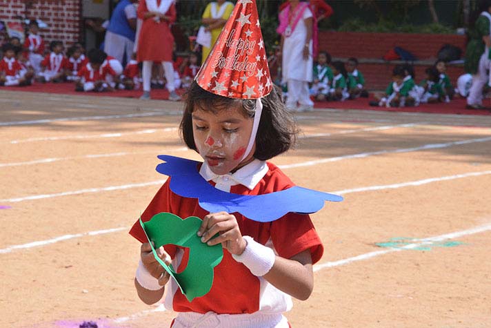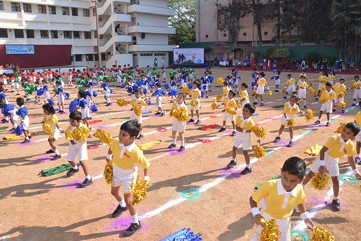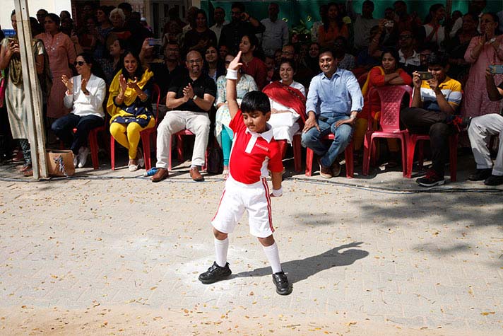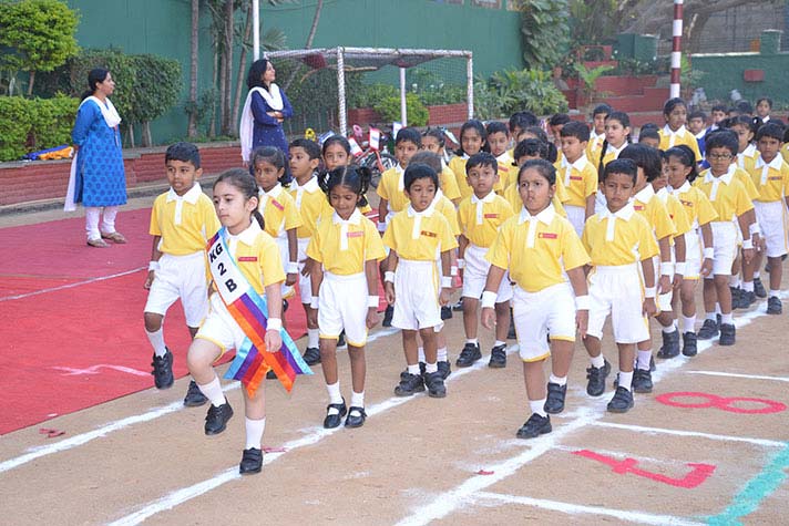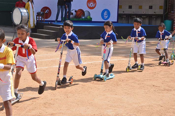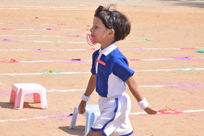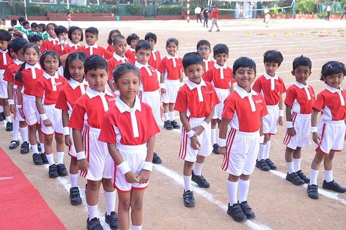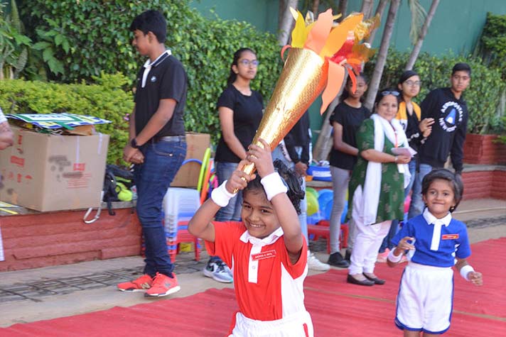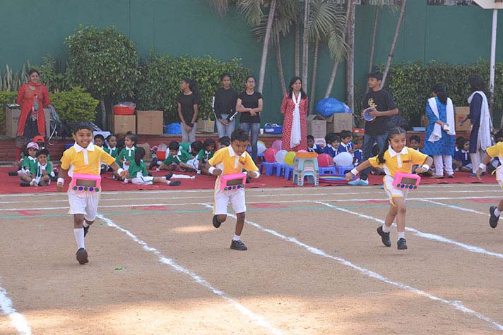 Sports play an important part in character building. In recognition of the need to inculcate the sporting spirit in children, the school organized the Annual Sports Day for kindergarten chil-dren on 15 February 2020. The event, named ‘Footloose 2020’, provided an ideal opportuni-ty for the children to demonstrate their prowess in various sporting disciplines. The students came in colour coded sports attire. The Sporting extravaganza commenced with the torch run by the students of both grades of KG. This was followed by a spectacular drill which the students put up for the entertainment of the parents. They performed various exercises using Pom-Poms, which was followed by Zumba exercises. The grand finale to the drill was a col-ourful well-coordinated Saree display. The children also participated in a wide range of races like ‘Drag the ball’, ‘Help your mother’ and ‘Balance Art’ to name a few. The parents enthu-siastically cheered on as the students took to the track to compete with their peers. A fitting finale to the day was a display by a few students who showcased their skating, cart wheel, hoola-hoop, scooter and cycling skills. The Sports Day helped children explore their hidden sports interests, to build confidence and to inculcate a desire to learn new skills by watching their peers. It was a fun filled day for one and all.