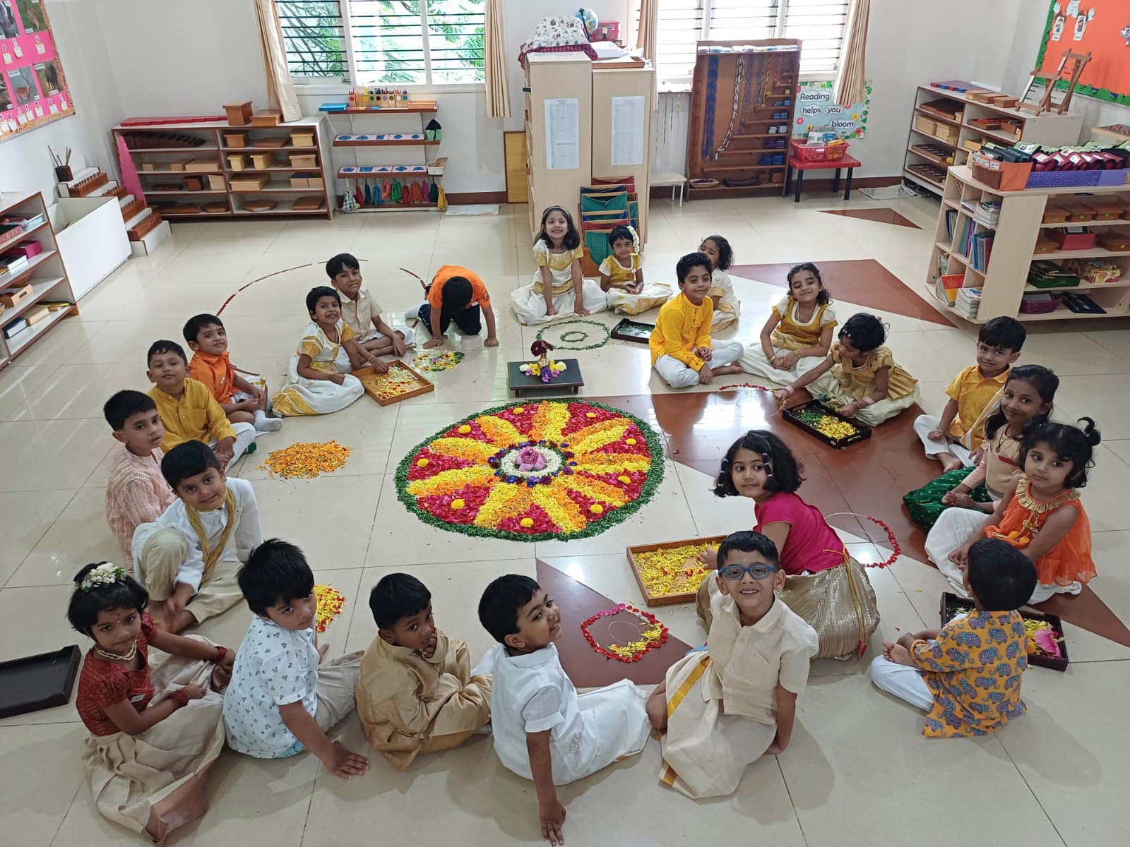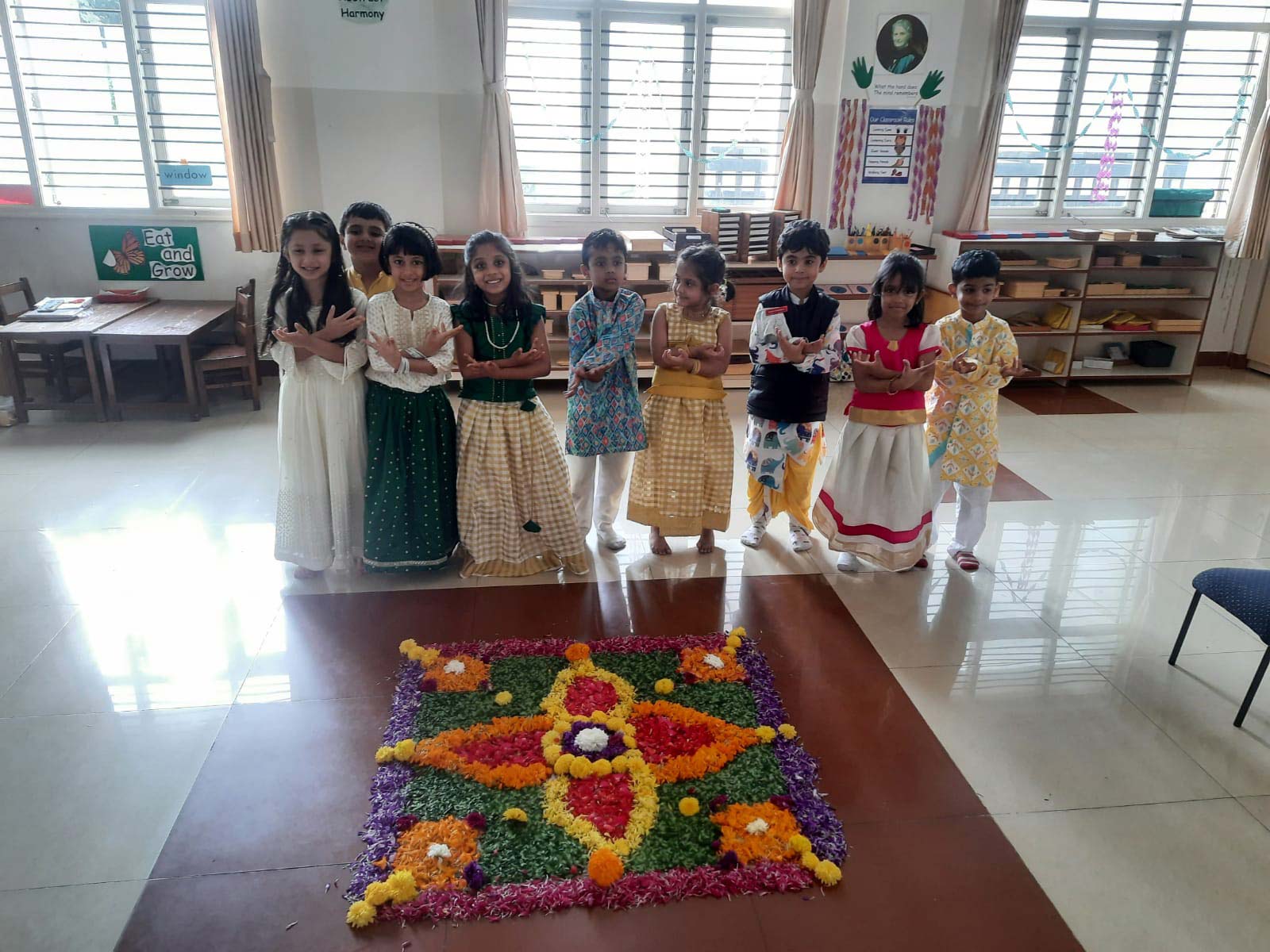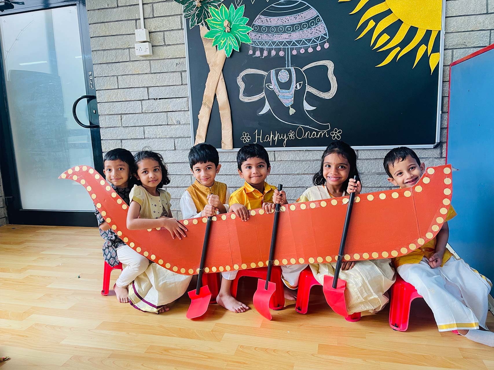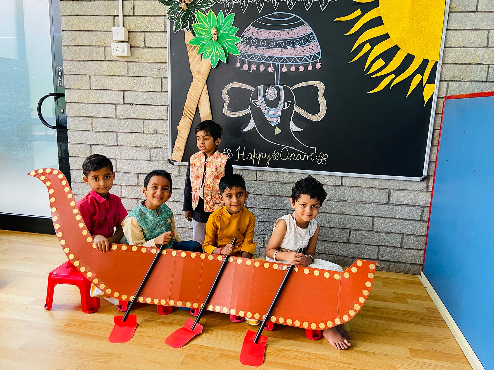The Montessori and Kindergarten children added a special charm to the celebrations as they arrived dressed in bright ethnic attire, many in the traditional cream and gold. Through stories, conversations, and hands-on activities, they were gently introduced to the rich culture of Kerala. Learning about the Onam Sadhya, traditional boat races, and folk dances became a joyful experience, especially as they worked together to create beautiful pookalams using flowers brought from home. The excitement was made even sweeter with traditional treats such as banana chips and sharkara upperi.