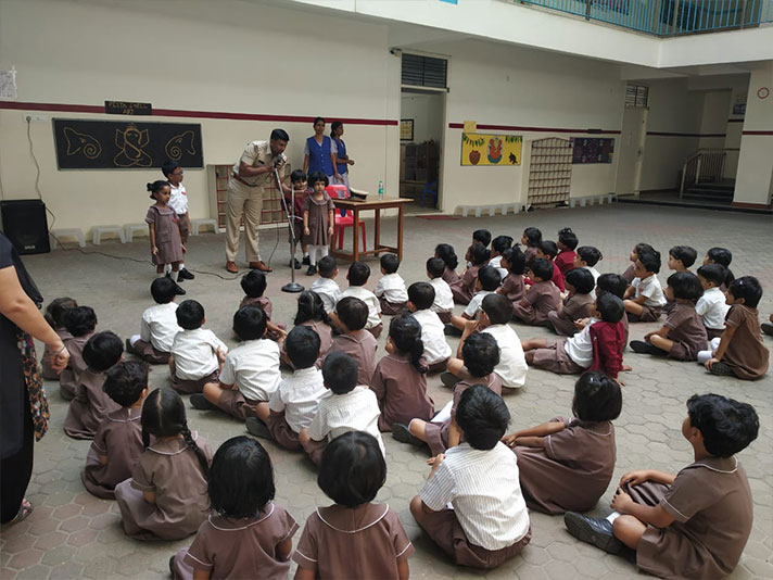 A Police Inspector and Dentist visit was organized in the month of October 2019 for the kindergarten 1 students as a learning extension to the EVS concept ‘People who help us’. The roles and responsibilities of Policemen were explained by the inspector along with the do’s and don’ts of personal safety through a role play. This was indeed a rare opportunity for the students to interact with the inspector and understand their contribution in keeping our homes and community safe.