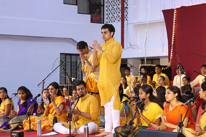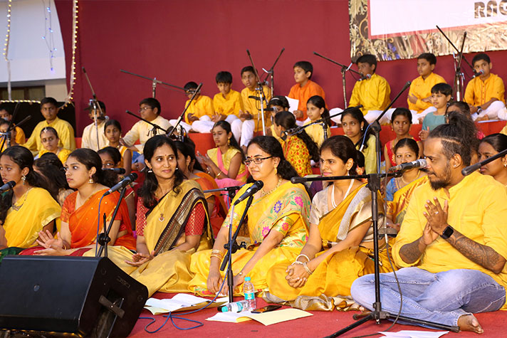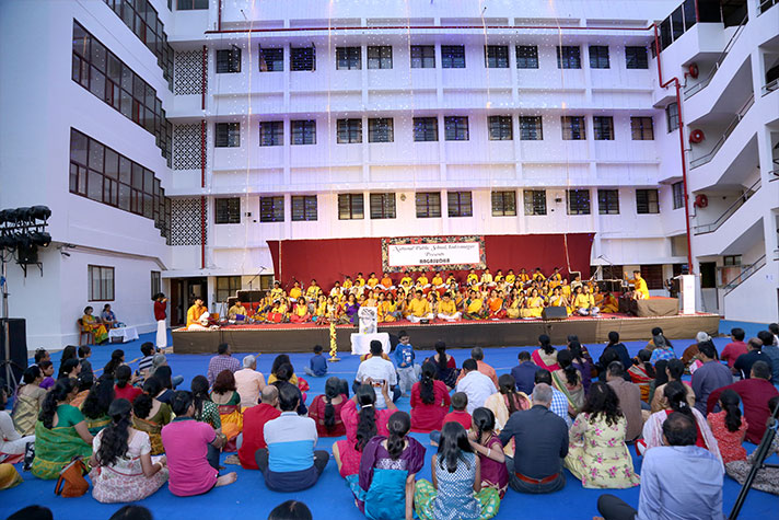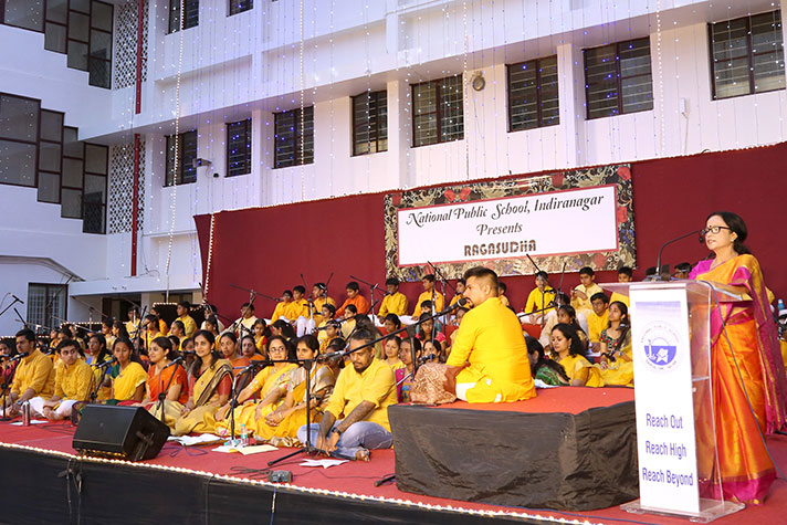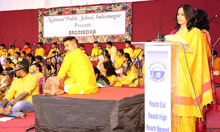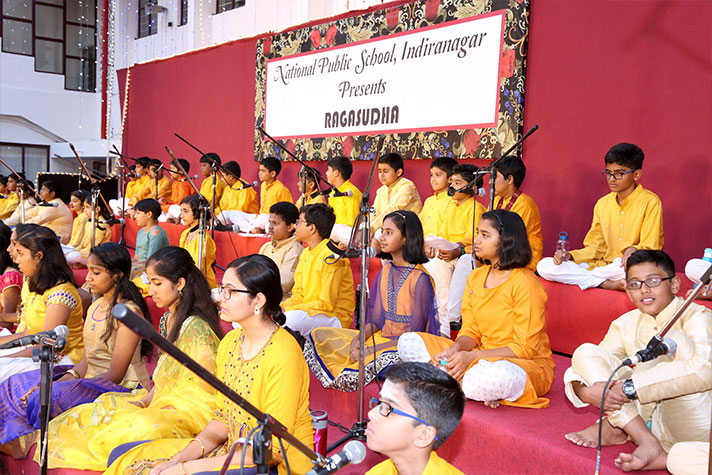National Public School, Indiranagar, organized “Ragasudha”, a musical programme, on 9 February 2020. The programme brought out the essence of Carnatic music and celebrated the contribution of Saint Tyagaraja through a group recital that showcased the talents of the young artistes of the school. The enthusiastic collaboration between a group of parents and teachers, who ably supported the students added a very interesting dimension to the whole programme.
