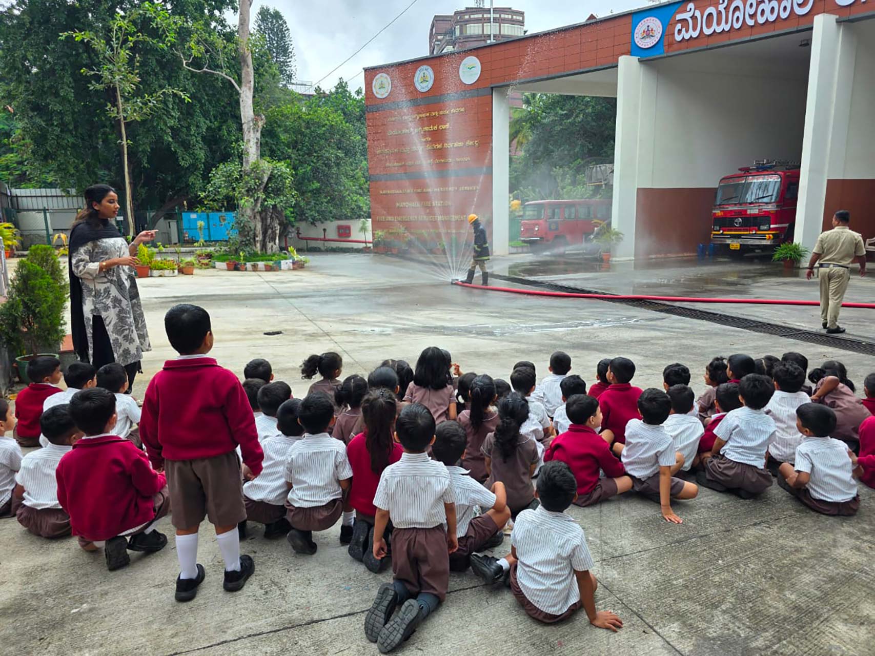 On Thursday, 16 October 2025, the Kindergarten students of National Public School, Indiranagar, visited the Mayo Hall Fire Station as an extension to their learning on ‘People Who Help Us’. Students were explained about the components of fire and the different types of fire. They witnessed a demonstration of practiced methods of extinguishing a fire, including a new addition to the firefighters’ toolkit, a robot that can move through narrow areas with a hose attached. Students were thrilled as the robot glided by, showering them with refreshing droplets from its hose. As a token of appreciation, the students presented the team with a card and a memento, and brought back good memories of the day.