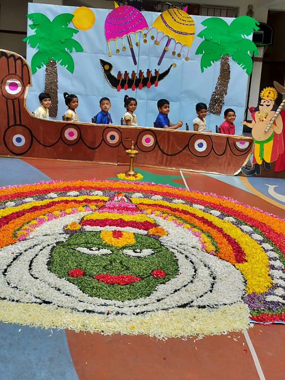 The Kindergarteners of National Public School, Indiranagar, celebrated Onam on Friday, 13 September 2024, with a combination of traditional dress-up, snacks and some colourful, creative Pookalams made by the little hands. They learnt about the history of Onam and the related snake boat race through a story narration. The vibrant, huge Kathakali Pookalam, a humongous snake boat and huge coconut trees created by the faculty, added liveliness, vigour and cheer to the festive environment.
