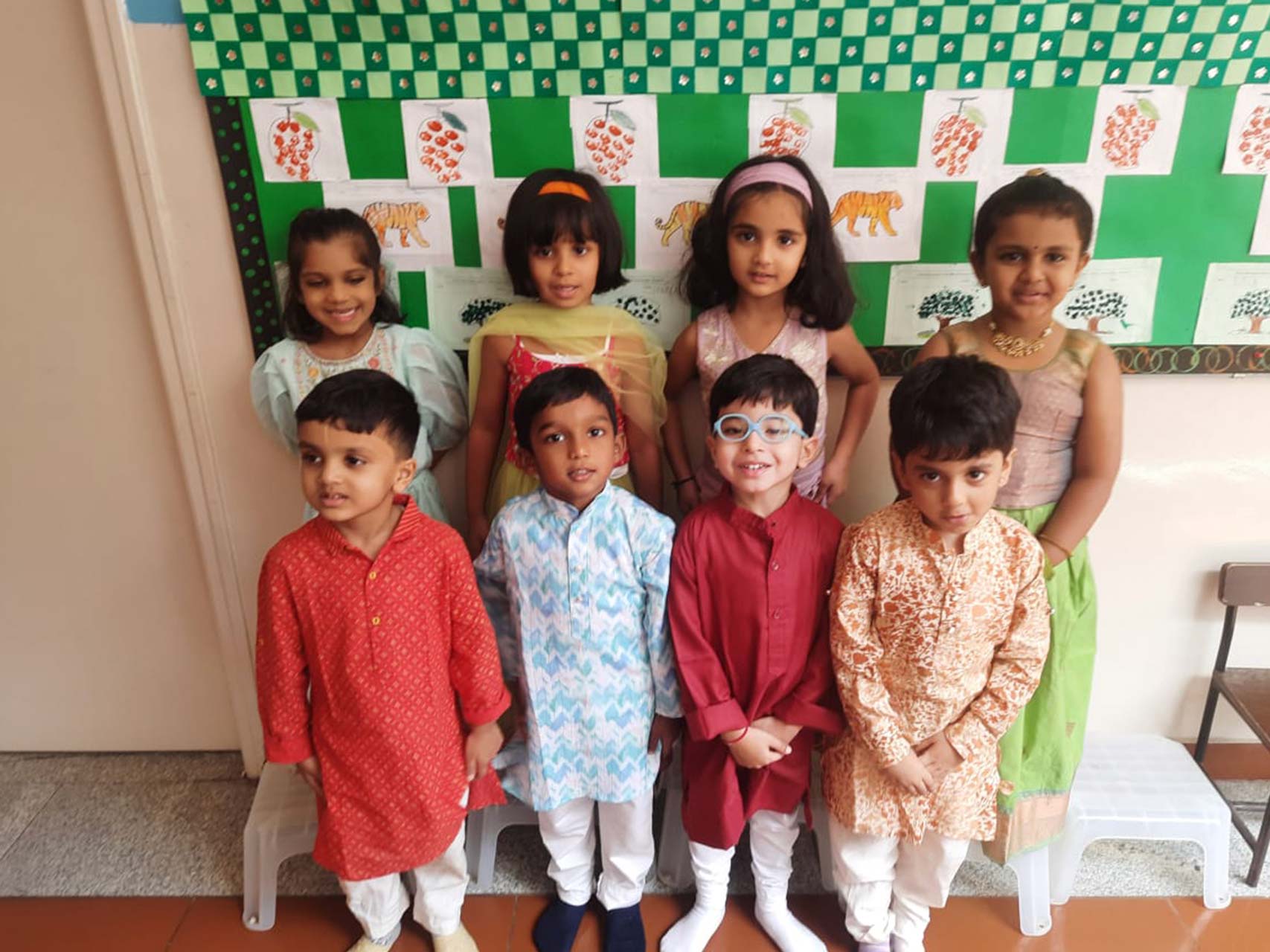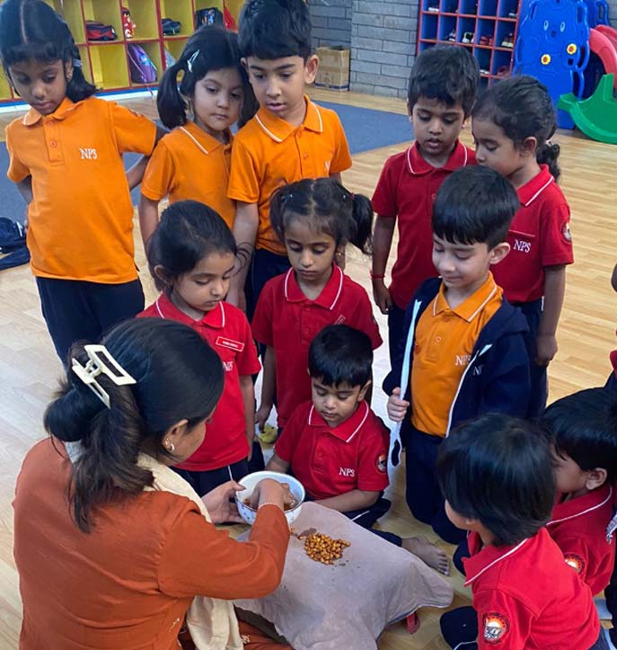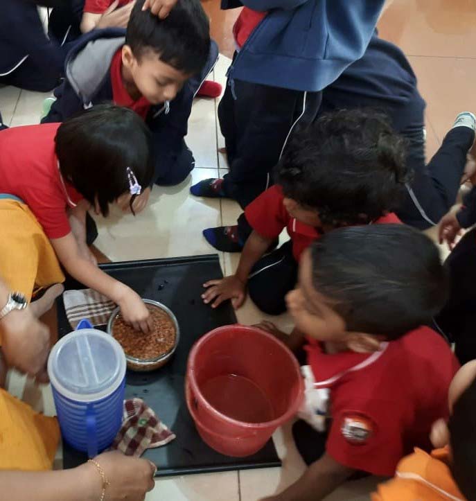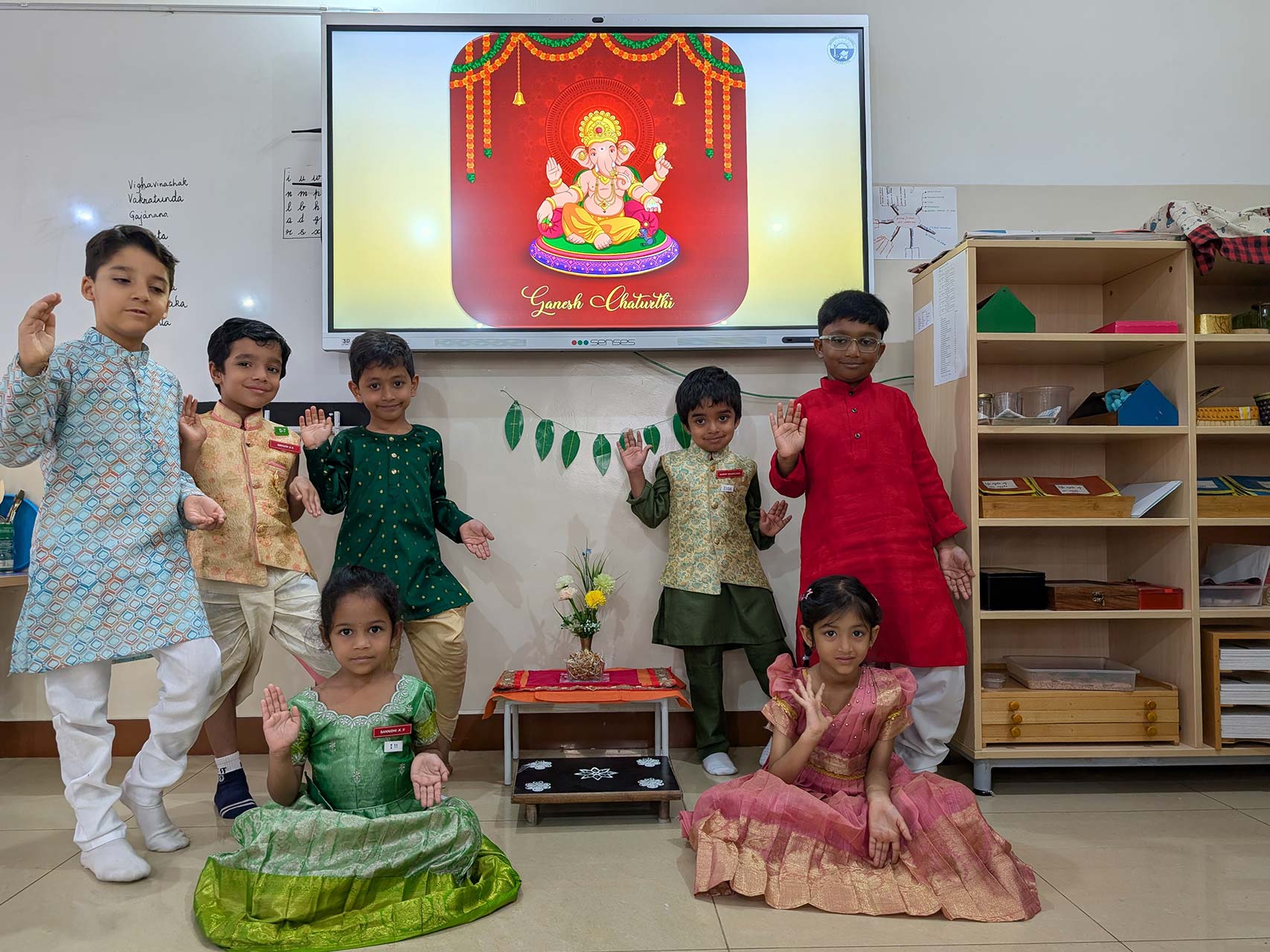 Ganesh Chaturthi celebrations in the Montessori began with the children brightening the school by wearing traditional clothes. A couple of days earlier, we had washed and soaked chana. The next morning, the soaked chana was put in a damp cloth to sprout. Imagine the children’s surprise and delight when they saw that the chana had sprouted so well after the weekend. They learnt about high-protein foods and the benefits of eating sprouts.