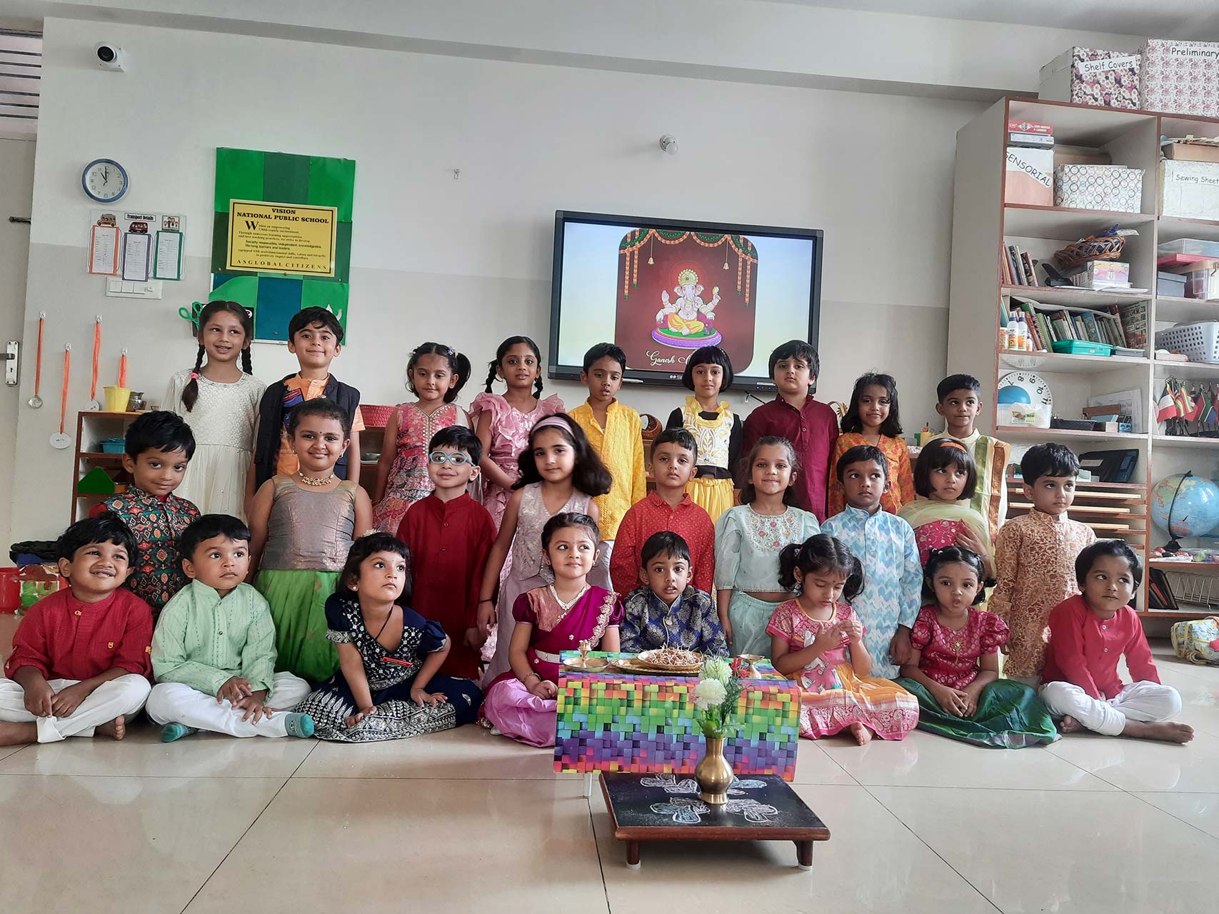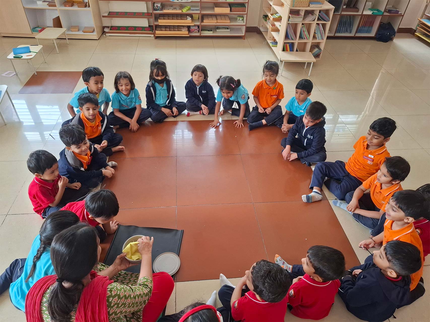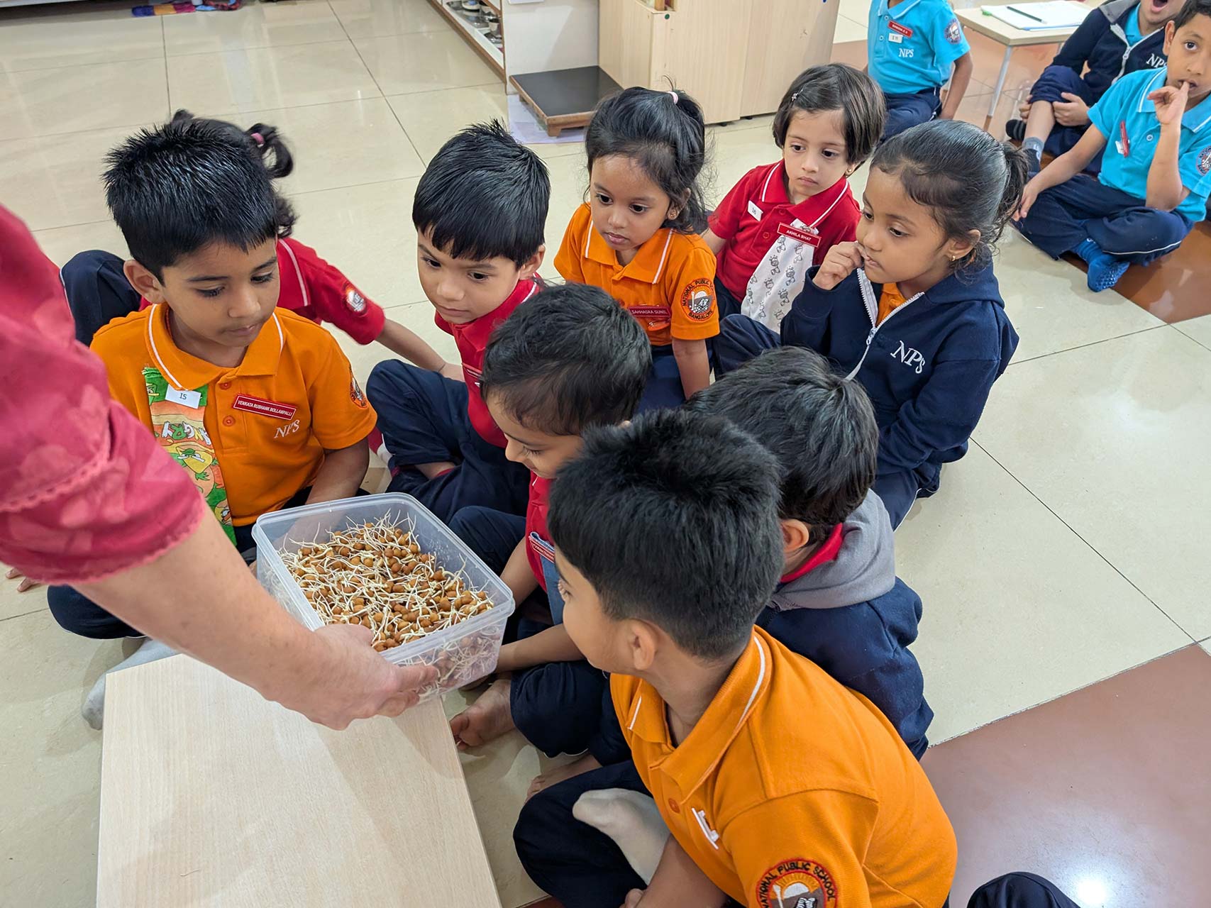 Ganesh Chaturthi celebrations in the Montessori began with the children brightening the school by wearing traditional clothes. A couple of days earlier, we had washed and soaked chana. The next morning, the soaked chana was put in a damp cloth to sprout. Imagine the children’s surprise and delight when they saw that the chana had sprouted so well after the weekend. They learnt about high-protein foods and the benefits of eating sprouts.