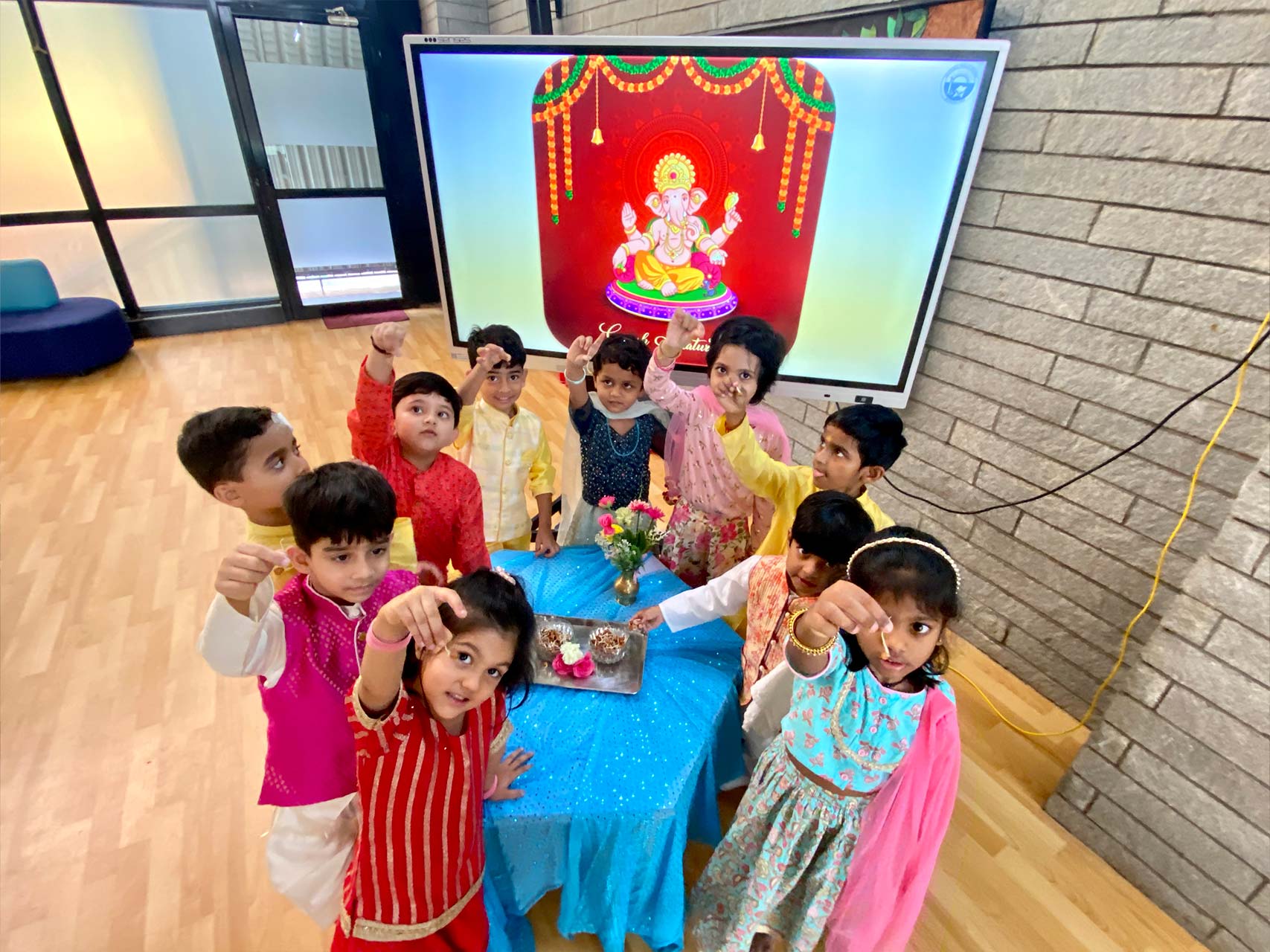 The children added to their vocabulary words, such as "mantap," "modak," and "mushik," and the various names of Ganesha. They also learnt to recite a Ganapati Shloka with actions.