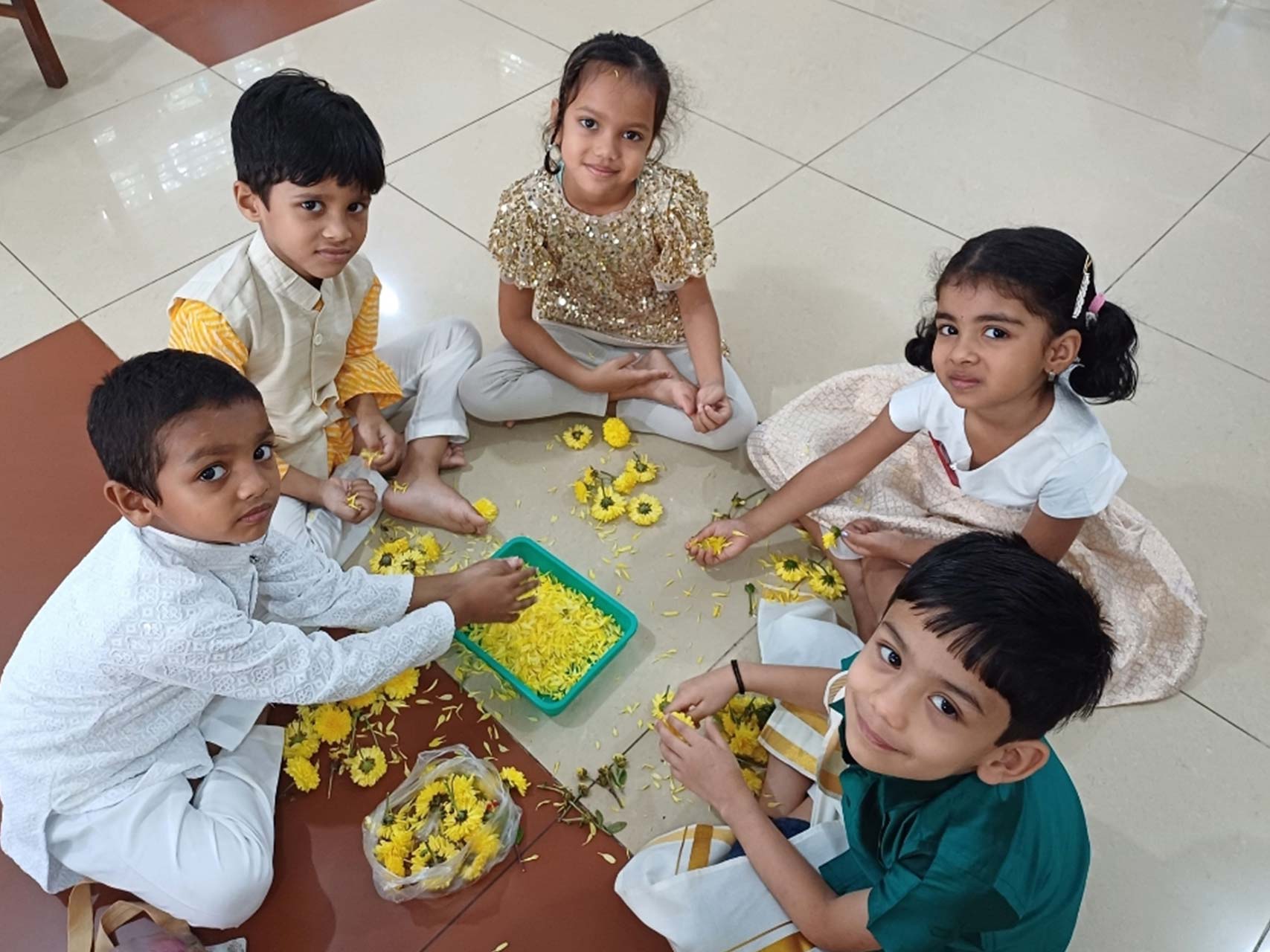 They had a hands-on experience of designing a pookalam in their classrooms with the flowers that they had brought from home.